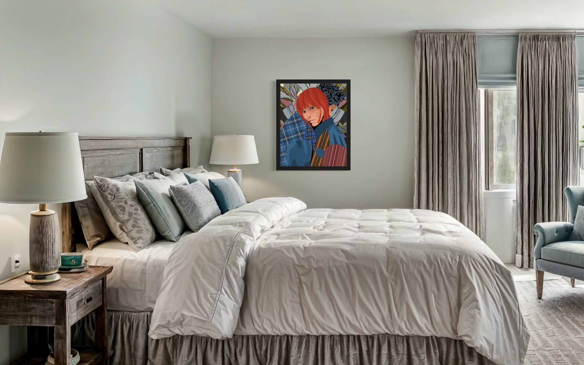 The subject's contemplative expression and eclectic attire draw the viewer in, while the abstract background adds a touch of intrigue. Through sharp angles and stylized forms, the artist skillfully captures the essence of a moment filled with both intimacy and tension. Don't miss the opportunity to explore this captivating artwork and uncover its hidden layers of meaning.
