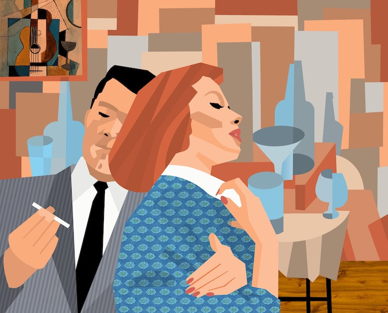 Bethany and Bradley are depicted in a stylized manner that suggests complacency and boredom. Bradley, dressed in a suit with a tie, holds a cigarette, while Bethany, in a patterned dress, is deciding what cocktail she desires. The modern, geometric composition creates a sophisticated, relaxed ambiance in an interior setting. Earthy tones mixed with blues suggest a contemporary retro elegance. The artwork explores the subject of substance dependency in modern society, reflecting on how boredom and complacency can lead to bad habits.