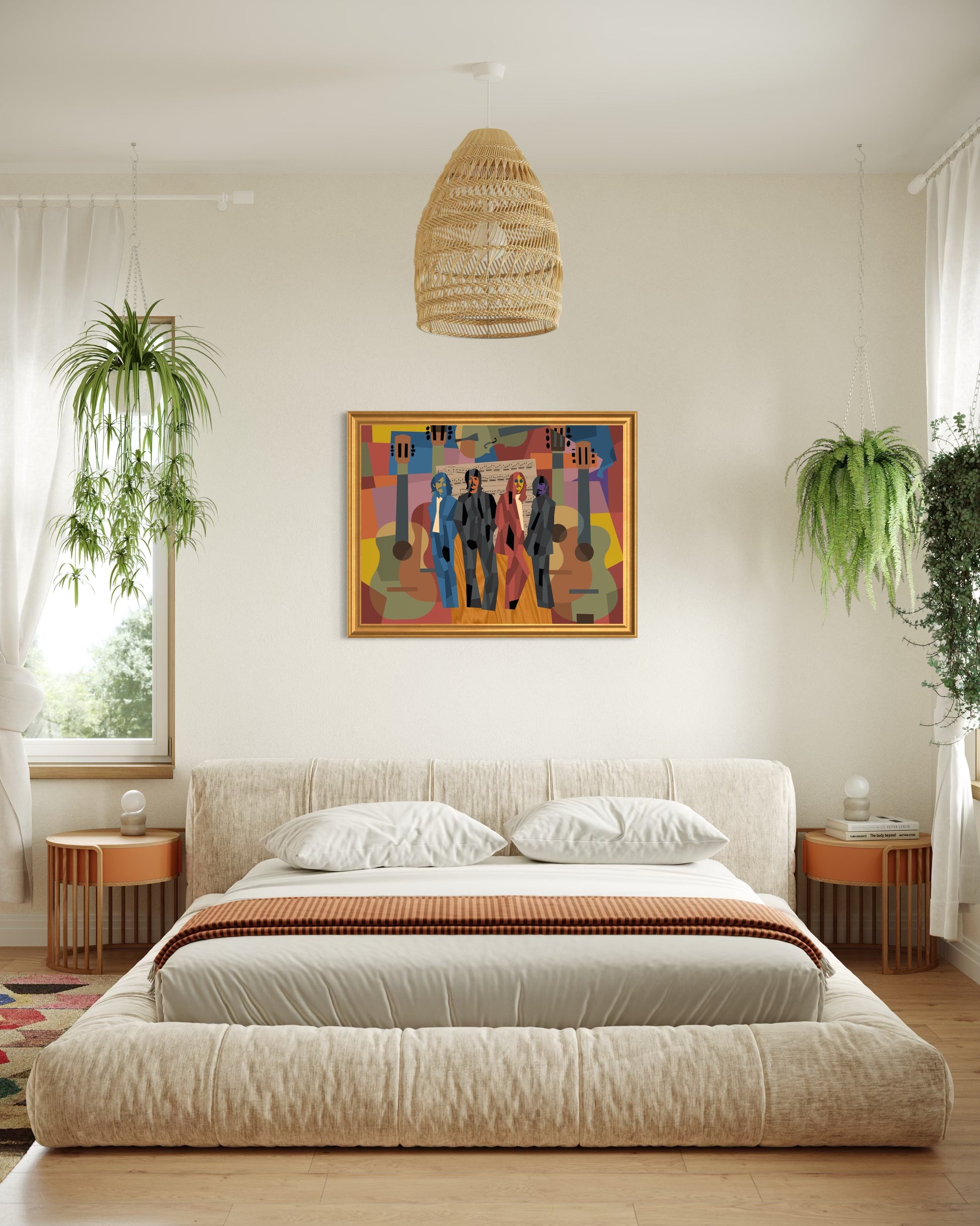 Let's Start a Band presents a structured yet fluid interaction between human presence and musical symbolism, rendered through a cubist lens that balances abstraction with recognizable form.