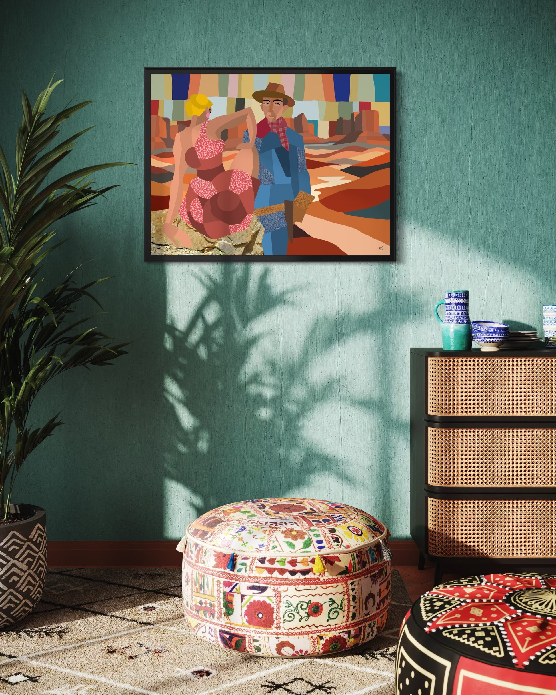 Nancy and Rocky is a distinctive artwork inspired by The Beatles’ song “Rocky Raccoon,” capturing the story’s blend of whimsy and mystery through a stylized desert scene. Featuring a seated woman, Nancy, in a red floral dress and a standing man, Rocky, in patchwork blues, the composition uses geometric fragmentation reminiscent of cubism to create a sophisticated interplay between figure and environment. Warm earth tones shape the abstract rocky landscape, while vertical pastel blocks form a striking, unconventional horizon that elevates the piece’s modernist appeal.