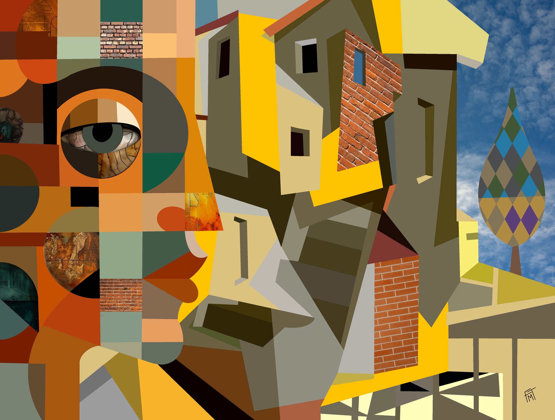 In "Penny," I explore the subtle merging of identity and environment through two overlapping profiles fractured into geometric shapes. Earth tones ground the composition, while architectural textures and abstract windows weave into the faces, suggesting a quiet dialogue between what is human and what is built.