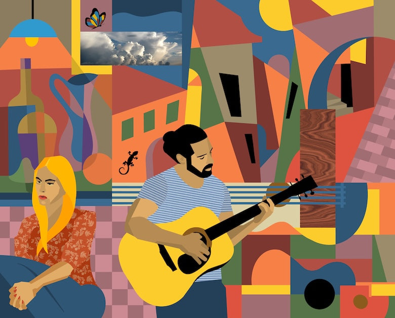 "Slow Drift in D Minor" is an abstract and colorful mixed media painting depicting two individuals set against a vibrant, geometric background.