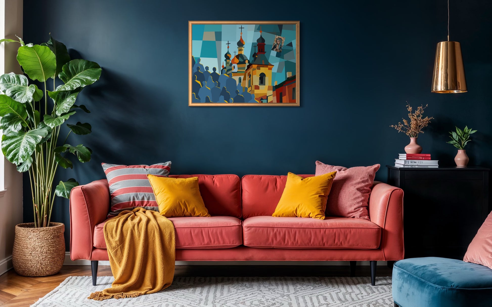 The artwork depicts a church through interlocking geometric shapes, with onion-shaped domes topped by crosses set against a fragmented deep blue background. Warm shades of orange, yellow, and dark brown define the structure, creating a dynamic contrast between form and space. In the lower left, a group of faceless figures rendered in shadowed blue with yellow outlines gathers quietly, suggesting a shared presence without individual identity.