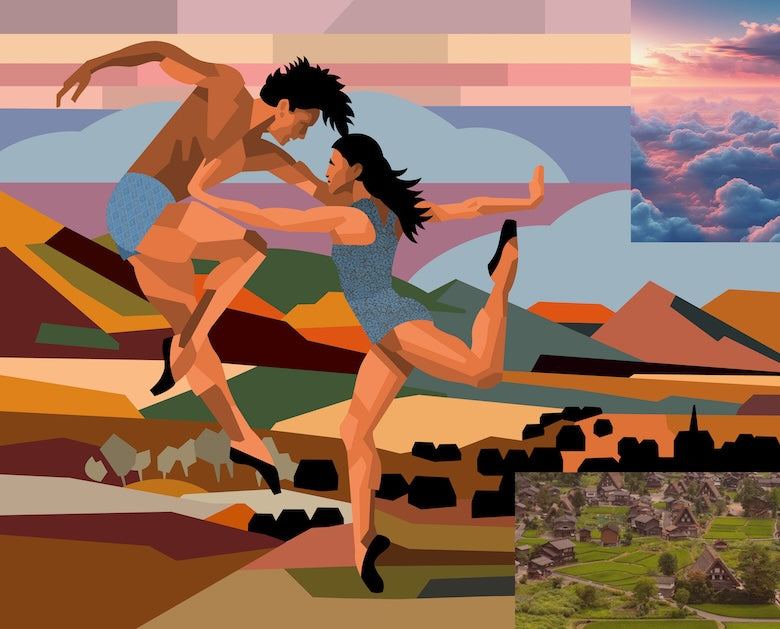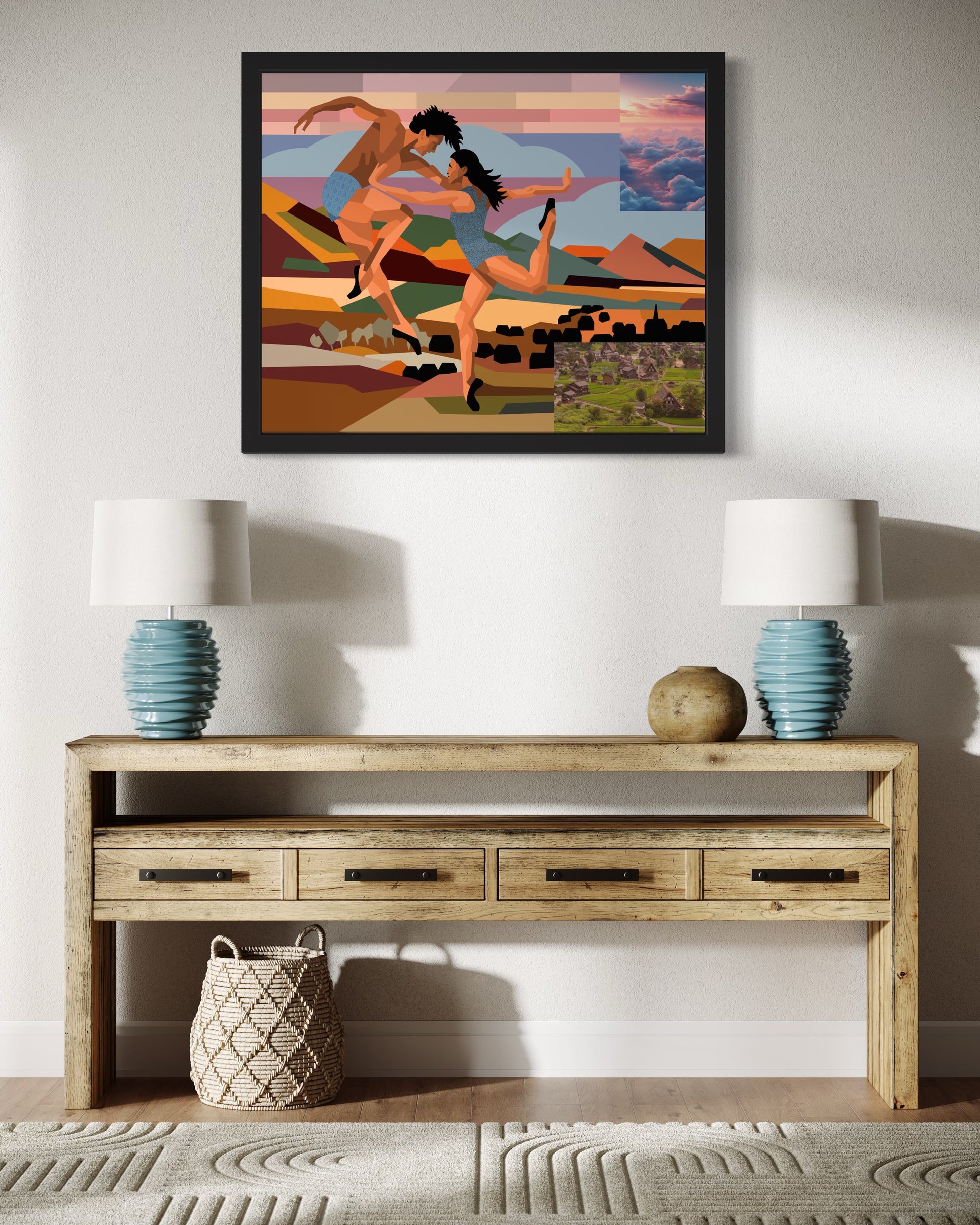 Set against a backdrop of geometric shapes forming an abstract landscape, the figures stand out in their vibrant athleticism and grace. The juxtaposition of the human form against the angular, earth-toned background creates a visually captivating contrast that draws the viewer in. Celebrate the beauty of movement and the power of human expression with this unique and inspiring piece of art.