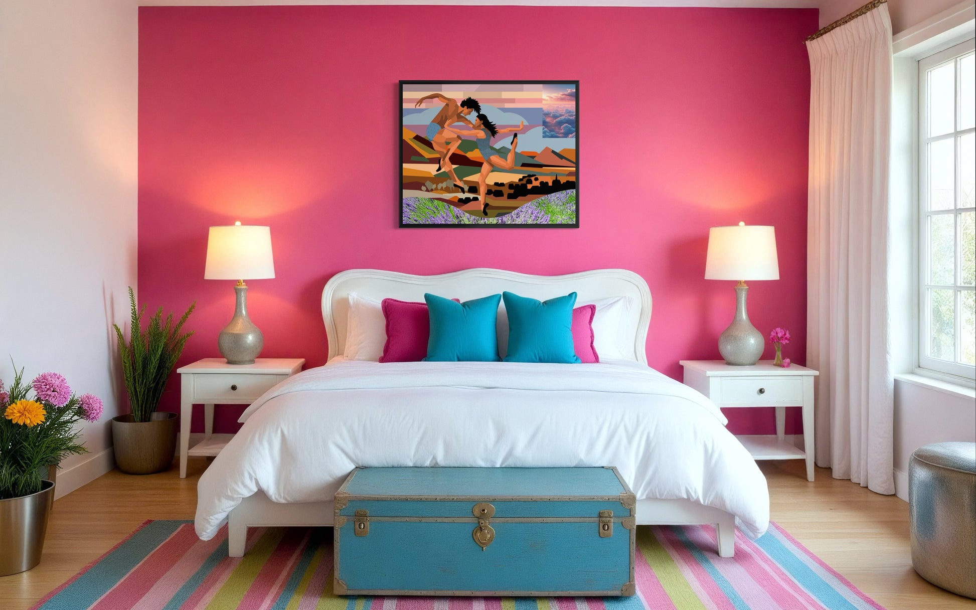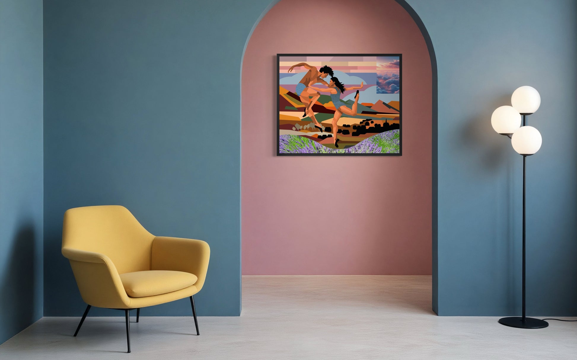 Village People playfully nods to the iconic New York disco band of the 1980s, but the artist takes an unexpected turn by relocating the scene from its urban origins to a vibrant mountain setting. The artwork presents a study in movement and form, where two dancers inhabit a space defined by intersecting planes and angular geometry. Their simplified, textured garments enhance the focus on posture and rhythm rather than detailed realism.