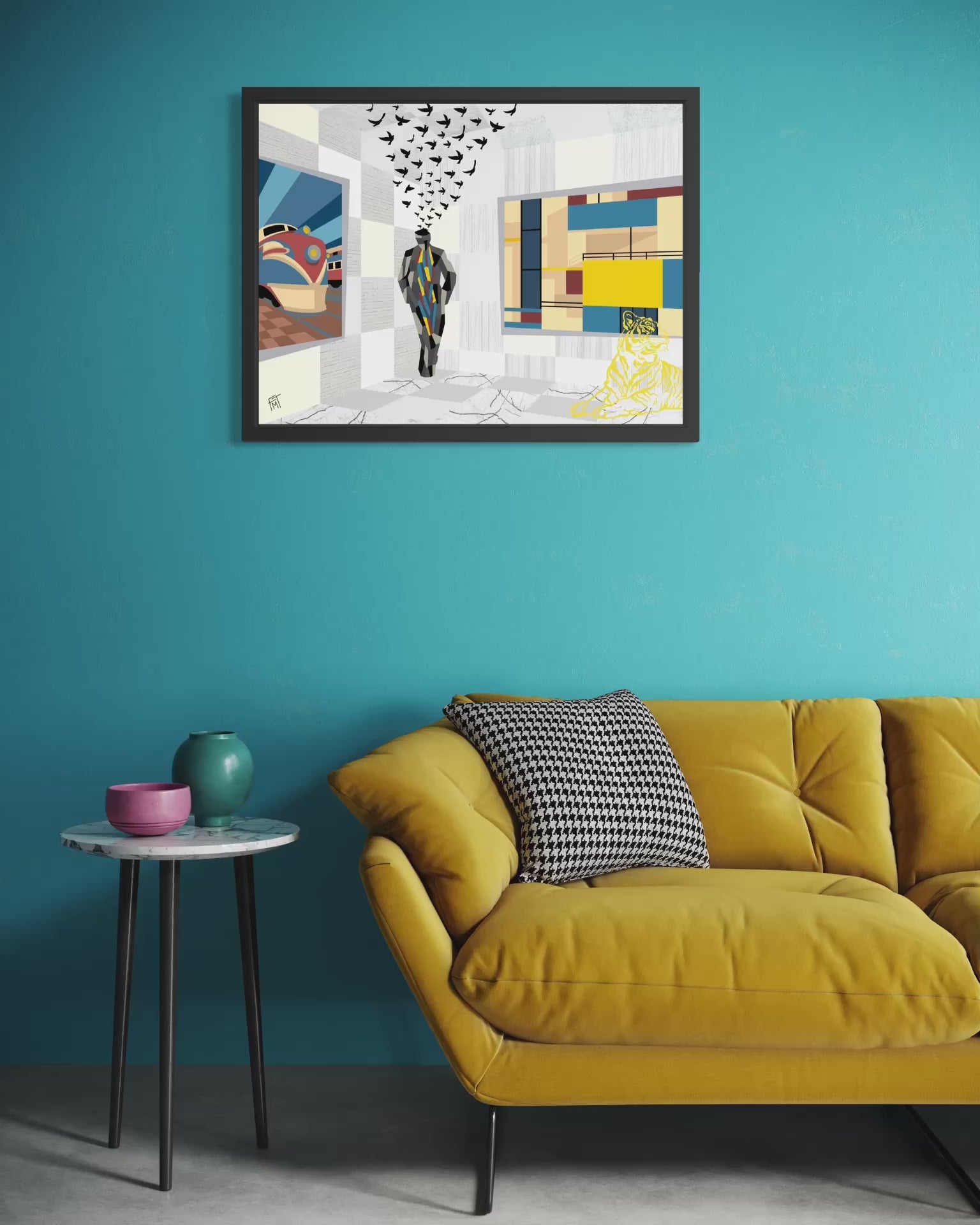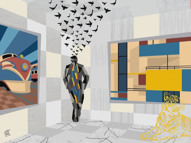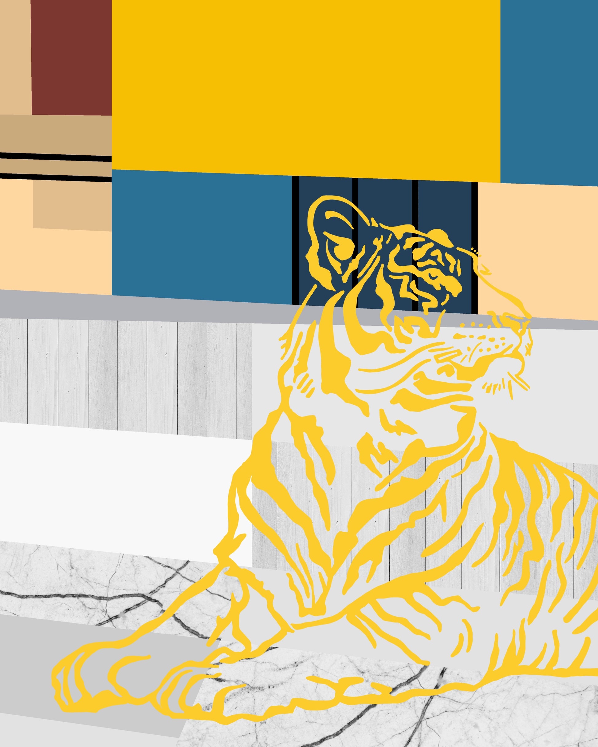 In the lower right, a reclining tiger drawn in bright yellow offers a subtle yet vivid surprise—a living presence sketched into the floor’s surface that serves as both symbol and talisman. The tiger’s poised silhouette carries a quiet humor alongside its enigmatic vitality, balancing wildness and control in a manner that mirrors the surrounding interplay of abstraction and figuration.